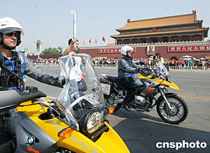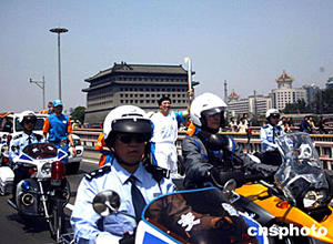 六月九日,二○○四年雅典奧運(yùn)火炬北京接力從人民大會(huì)堂東門外廣場(chǎng)起程,將經(jīng)過一百四十八名火炬手傳遞五十五公里到達(dá)終點(diǎn)頤和園。圖武警國旗護(hù)衛(wèi)隊(duì)?wèi)?zhàn)士阮野在雅典奧運(yùn)火炬護(hù)衛(wèi)騎警的護(hù)衛(wèi)下跑過天安門。中新社記者:鄭萍萍