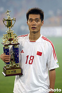 二○○六年德國世界杯男子足球賽亞洲區(qū)預(yù)賽中國隊對馬來西亞隊的比賽六月九日晚在天津舉行,中國隊以4:0取勝,獲得預(yù)選賽小組賽三連勝。李霄鵬獨中二元,被評為本場比賽最佳球員。中新社記者:毛建軍