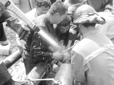 據(jù)朝陽市消防局副局長姚安介紹:“我們共出動70余名官兵、10臺消防車。由于汽油管道發(fā)生炸裂,引起了另一條柴油輸送管道的法蘭盤(管道的接頭)向外泄漏柴油,現(xiàn)在這7條輸油管道每條里都有5噸油,一旦引爆后果不堪設(shè)想。我們用兩臺泡沫滅火車和若干水槍給管道降溫,同時用來稀釋泄漏的柴油,并更換法蘭盤!