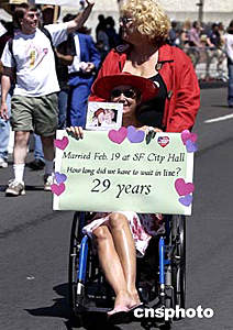 美西圣荷西市六月十三日舉行第二十九屆同性戀游行,一對(duì)相戀二十九年、今年二月十九日在加州舊金山市政府登記結(jié)婚的同性伴侶參加游行。現(xiàn)在,舊金山和圣荷西市所在的加利福尼亞州法院尚未批準(zhǔn)同性婚姻合法。作者:陳鋼