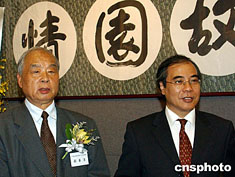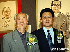 “邵華澤、李琦、馮真書畫展”六月十四日在香港大會(huì)堂開幕,圖為邵華澤與《大公報(bào)》副社長(zhǎng)在書畫展上。中新社記者:錢興強(qiáng)