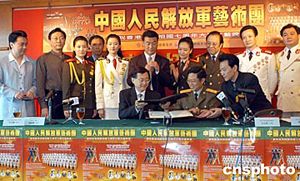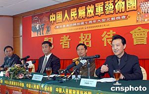 為慶祝香港回歸祖國(guó)七周年,中國(guó)人民解放軍藝術(shù)團(tuán)6月21日抵港并舉行記者會(huì),解放軍藝術(shù)團(tuán)團(tuán)長(zhǎng)王兆海少將與東華三院主席陳耀莊簽署捐贈(zèng)協(xié)議。藝術(shù)團(tuán)將在23、24日在紅館演出,門票全部售罄,收入全部捐贈(zèng)香港東華三院作慈善服務(wù)經(jīng)費(fèi)。作者:鄧慶樂
