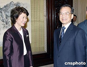 中國國務(wù)院總理溫家寶六月二十二日在北京中南海會見來訪的美國勞工部長趙小蘭。中新社記者:毛建軍