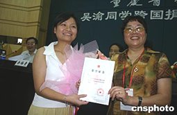 圖:中國跨國捐獻骨髓第一人頒發(fā)榮譽證書