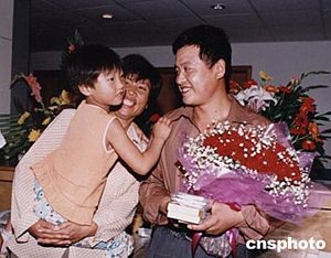 在阿富汗恐怖襲擊事件中受傷的山東諸城工人王金生六月二十三日上午傷愈出院,與前來迎接他的妻子和女兒重新團聚。作者:胡洪林