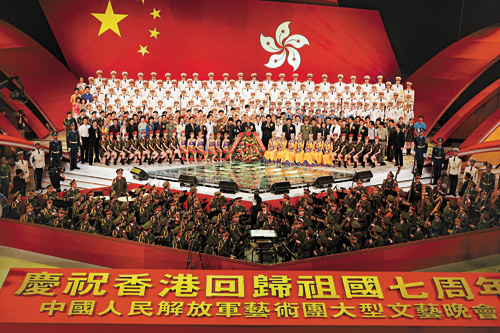 中新網(wǎng)6月24日電 據(jù)香港大公報(bào)報(bào)道,中國(guó)人民解放軍藝術(shù)團(tuán)昨晚在香港紅磡體育館舉行“慶祝香港回歸七周年大型文藝晚會(huì)”首場(chǎng)演出。特區(qū)行政長(zhǎng)官董建華、中央駐港聯(lián)絡(luò)辦主任高祀仁,副主任李剛,外交部駐港特派員楊文昌、解放軍駐港部隊(duì)司令員王繼堂、政委王玉發(fā),特區(qū)律政司司長(zhǎng)梁愛(ài)詩(shī)等出席觀看了晚會(huì)。