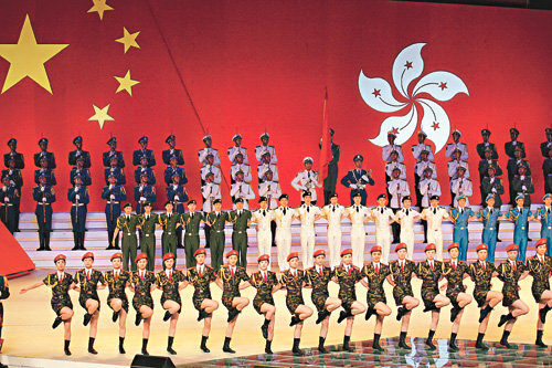 在“香港你好”一章中,藝術(shù)團(tuán)還特別演唱了“獅子山下”、“東方之珠”等反映香港市民生活和自強(qiáng)不息的歌曲!皵y手踏平崎嶇……用艱辛努力寫(xiě)下那不朽香江名句”,市民熟悉的歌詞在場(chǎng)內(nèi)回旋,這是香港人的心聲,也是藝術(shù)團(tuán)對(duì)香港的美好祝愿,數(shù)千名觀眾以如潮的掌聲熱烈回應(yīng)藝術(shù)家們的深情祝福。