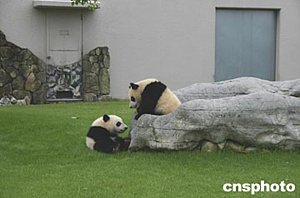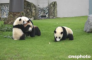 六月下旬,世界第一對(duì)由母體同時(shí)撫育長(zhǎng)大的大熊貓“隆浜”和“秋浜”與母親“梅梅”在日本和歌山白浜野生動(dòng)物園草坪上玩耍。這對(duì)雙胞胎二零零三年九月八日出生在日本,“隆浜”現(xiàn)在體重已達(dá)十七點(diǎn)九公斤,“秋浜”達(dá)十九點(diǎn)三五公斤,體態(tài)嬌憨,十分惹人喜愛。一般說來,熊貓產(chǎn)下雙胞胎,由于顧此失彼,很難由母體成功地?fù)嵊。作?肖龍聯(lián)