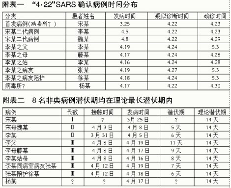 另外,賀雄介紹,以宋某為一代病例,從后續(xù)病例與前代最早接觸時(shí)間為暴露點(diǎn)開始計(jì)算,北京“4.22”SARS疫情中傳播鏈清晰的8名病例的潛伏期均在傳染性非典型肺炎理論最長(zhǎng)潛伏期之內(nèi)。但首發(fā)病例宋某的接觸病毒時(shí)間和潛伏期尚無(wú)法推算;病毒病所博士生———患者楊某的接觸時(shí)間、傳播鏈位置和潛伏期亦存在疑問。