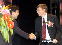微軟公司董事長兼首席軟件架構(gòu)師比爾·蓋茨,7月1日出席在北京舉行的2004微軟新技術(shù)展望大會,并為2500余名大學(xué)生及2000位軟件開發(fā)人員演講,并共同探討未來無縫計(jì)算的發(fā)展趨勢。圖為微軟亞洲研究院院長沈向洋(左)與比爾·蓋茨握手。中新社記者:張宇