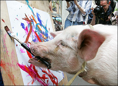 “豬的藝術(shù)”:一只被稱(chēng)作“Malevich”的小豬在莫斯科市區(qū)“作畫(huà)”,這是當(dāng)?shù)厮囆g(shù)家展示動(dòng)物繪畫(huà)技藝的一部分。