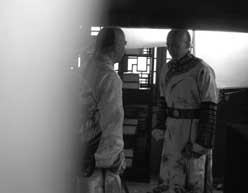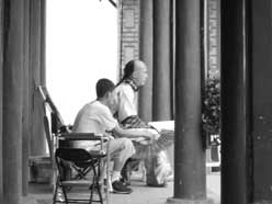 記者前天11時(shí)許來到懷柔飛騰影視基地時(shí),天氣十分炎熱,在基地尋找了10多分鐘,后在一個(gè)小院旁邊發(fā)現(xiàn)了《紀(jì)曉嵐3》劇組的道具車。順藤摸瓜,記者把相機(jī)放在褲包里悄悄走了進(jìn)去。一間封閉的小房間里傳出了張國立和王剛對(duì)臺(tái)詞的聲音。但是記者還未移到攝像機(jī)后,立即有工作人員逼問:“你是干什么的?出去出去!”記者說是影迷,只想看看張國立拍戲,工作人員仍然不放行:“不行!你快點(diǎn)出去,別影響我們拍戲!”