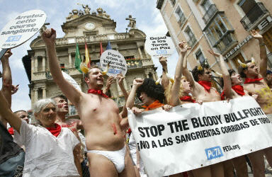 抗議隊(duì)伍沿著奔牛節(jié)中野牛奔跑的狹窄街道前進(jìn),他們高呼:“肉體折磨和摧殘并非是西班牙文化!停止血腥的奔;顒(dòng)!”