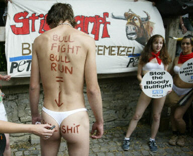 示威者們指出,為了吸引成千上萬的游客,潘普洛納每年都?xì)埲痰貙Υ笈,并在斗牛前對公牛進(jìn)行針刺、鞭打等各種折磨以令其害怕,而這些虐待動(dòng)物的行為都是應(yīng)該被制止的。