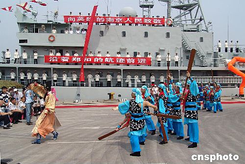 中國(guó)海軍建造的第一艘遠(yuǎn)洋航海訓(xùn)練艦“鄭和”號(hào),七月十日抵達(dá)南京港龍?zhí)洞a頭,受到各界人士的熱烈歡迎。南京是鄭和下西洋的決策地,也是他長(zhǎng)期生活的地方,至今該市仍保存著許多有關(guān)鄭和的遺跡。王曉紅 攝