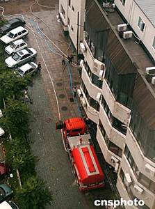 七月十一日,北京消防隊(duì)的消防車在遭遇罕見(jiàn)雷暴雨后地下設(shè)施被淹沒(méi)的中國(guó)新聞社大廈和西城電話局抽水排除水患。十日的特大雷暴雨將不少北京市的樓宇地下室淹沒(méi)。中新社記者:鄒憲