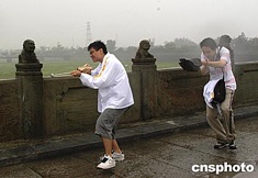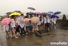 香港中學生社會實踐旅游團隊的學生們,七月十一日冒雨參觀北京郊外盧溝橋,實地感受、了解中國近代歷史的滄桑歷程。中新社記者:鄒憲