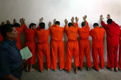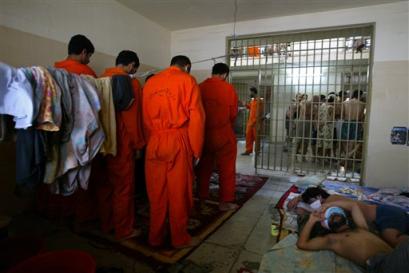 曾發(fā)生美軍虐待政治犯事件的1A和1B囚室目前關(guān)押著鬧事者和問題犯人。監(jiān)獄內(nèi)由伊拉克控制的監(jiān)區(qū)共關(guān)押有1200名犯人。在大多數(shù)囚室里,由于夏天溫度很高,犯人們都毫無生氣地躺在地上的泡沫床墊上,多數(shù)人穿著白色的長短褲或者更少的衣服。