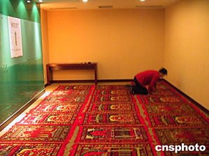 七月十五日,二零零四年中國亞洲杯足球賽重慶賽區(qū)舉行了指定下榻酒店揭牌儀式,為尊重不同國家的宗教和風俗習慣,指定酒店還準備了禱告房。圖為工作人員正在布置重慶賽區(qū)球隊下榻酒店內(nèi)的禱告房。二零零四年中國亞洲杯足球賽將于七月十七日正式開幕。作者:郭晉嘉