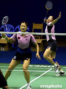 中國羽毛球隊(duì)女雙隊(duì)員黃穗(前)、上屆奧運(yùn)會(huì)混雙冠軍高崚,十五日在湖南益陽訓(xùn)練基地緊張訓(xùn)練,備戰(zhàn)雅典奧運(yùn)會(huì)。中新社記者:宋吉河  趙婷婷緊張備戰(zhàn)雅典奧運(yùn)。中新社記者:宋吉河