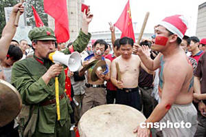 七月十七日,一名中國(guó)球迷身著解放軍舊式軍服,手舉“紅寶書”,和同伴一起祝愿中國(guó)足球隊(duì)在亞洲杯賽上取得好成績(jī)。二零零四年亞洲杯足球賽當(dāng)晚在北京開幕。中新社記者:毛建軍