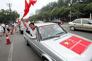 遼寧盤錦球迷驅(qū)車趕到北京,觀看七月十七日晚在北京工人體育場(chǎng)舉行的二零零四年亞洲杯足球賽揭幕戰(zhàn)。中新社記者:毛建軍