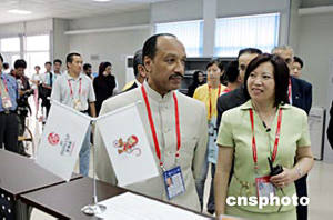 二零零四年亞洲杯足球賽七月十七日晚在北京工人體育場(chǎng)開幕,開幕式前,亞足聯(lián)主席哈曼在工作人員陪同下考察新聞中心等設(shè)施。中新社記者:毛建軍