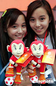 二零零四年亞洲杯足球賽七月十七日晚在北京工人體育場(chǎng)開幕,開幕式前,一對(duì)在北京廣播學(xué)院就讀的雙胞胎姐妹在場(chǎng)外推銷可愛(ài)的吉祥物猴子“貝貝”。中新社記者:毛建軍