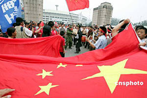 七月十七日,中國(guó)球迷在亞洲杯足球賽開幕式會(huì)場(chǎng)外吶喊,為亞洲杯首度在中國(guó)舉辦而喝彩。二零零四年亞洲杯足球賽當(dāng)晚在北京開幕。中新社記者:毛建軍