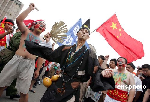 一名球迷十七日裝扮成“濟(jì)公”形象,在亞洲杯足球賽開幕式會(huì)場外吶喊,為亞洲杯首度在中國舉辦而喝彩。二零零四年亞洲杯足球賽十七日晚在北京開幕。作者:毛建軍