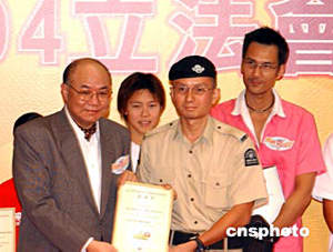 2004年香港立法會選舉開幕典禮17日在文化中心大堂舉行﹐選舉管理委員會主席胡國興大法官向選舉大使頒發(fā)證書。