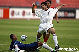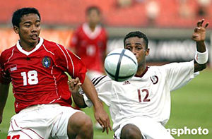 2004年亞洲杯足球賽A組第二場(chǎng)比賽卡特爾隊(duì)對(duì)印度尼西亞隊(duì)的比賽,7月18日在北京工人體育場(chǎng)賽進(jìn)行?ㄋ栮(duì)得勢(shì)不得分,最終被“黑馬”印度尼西亞隊(duì)以二比一戰(zhàn)勝。作者:盛佳鵬