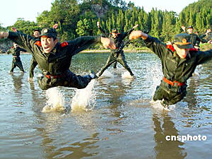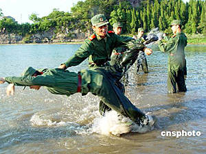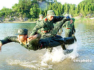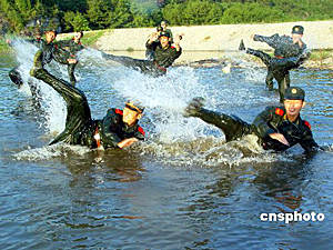 7月18日,浙江省仙居縣武警官兵頂著烈日,冒著酷暑進(jìn)行水上高難項(xiàng)目訓(xùn)練。為適應(yīng)水上戰(zhàn)斗能力,仙居縣武警官兵頂著烈日,開始進(jìn)行為期15天的水上訓(xùn)練。華文武 攝