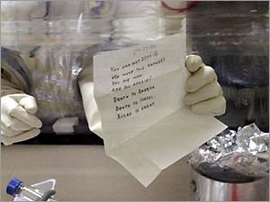 2001年發(fā)生的炭菌襲擊共造成5人死亡、17人受傷。911襲擊一個月后,沾有炭菌粉末的郵件被投寄到政府辦公室、新聞機構(gòu)、紐約郵局和多名參議員,造成多家機構(gòu)關(guān)閉,老百姓人心動蕩。目前還沒有一人因炭菌襲擊被起訴。