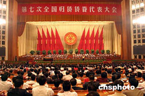 中新社北京七月二十日電 第七次全國(guó)歸僑僑眷代表大會(huì)二十日在人民大會(huì)堂隆重開幕。胡錦濤、吳邦國(guó)、溫家寶、賈慶林、曾慶紅、黃菊、吳官正、李長(zhǎng)春、羅干等黨和國(guó)家領(lǐng)導(dǎo)人到會(huì)祝賀。