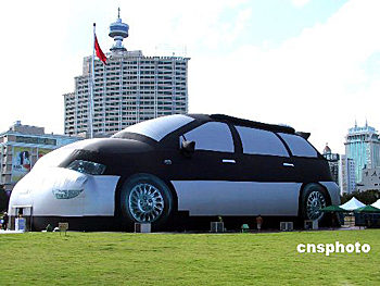 二○○四年七月二十二日,福建福州市五一廣場(chǎng)出現(xiàn)一巨型充氣汽車模型。據(jù)悉,那是商家為即將在此地舉辦的車展造勢(shì)。王東明 攝