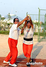 國家田徑隊(duì)女子鏈球組優(yōu)秀運(yùn)動員顧原(右),二○○四年七月中旬在日照山東省體院訓(xùn)練基地緊張訓(xùn)練,備戰(zhàn)雅典奧運(yùn)會。圖為教練歐喜元(左)正在為顧原做技術(shù)指導(dǎo)。中新社記者:張勤