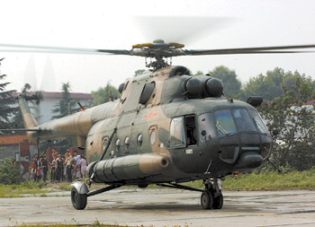 23日上午9時40分,直升機(jī)的引擎發(fā)動,緩緩升上空中作短暫懸停后,直升機(jī)拉升高度,向昆明飛去。根據(jù)安排,飛機(jī)將在昆明國際機(jī)場作短暫停留后,飛向在芒市的基地,然后飛赴盈江縣城裝載食品、帳篷和醫(yī)藥救災(zāi)物資,執(zhí)行空投任務(wù)。