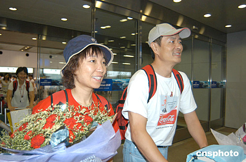 七月二十六日下午,代表全球華人參加二零零四雅典奧運圣火希臘本土傳遞的孫雯和濮存昕結(jié)束了華人火炬手的首次奧運圣火之旅返抵北京國際機場。兩人與成龍作為中國火炬手于七月二十四日參加了希臘本土的奧運圣火傳遞。作者:徐曦弋