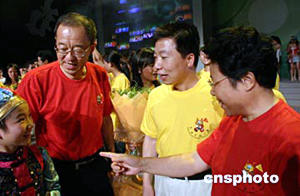七月二十九日晚,中國首飛太空航天員楊利偉(右二)在北京奧林匹克體育館出席了《中國尋根之旅夏令營》聯(lián)歡晚會(huì),與會(huì)的中外青少年與他們心目中的英雄零距離接觸感到十分高興。中新社記者:史利