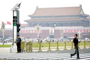 中新網(wǎng)8月2日電 據(jù)《京華時(shí)報(bào)》報(bào)道,昨天,北京市首個(gè)太陽(yáng)能人行橫道交通信號(hào)燈在天安門(mén)廣場(chǎng)投入使用。據(jù)介紹,這也是建國(guó)以來(lái)天安門(mén)廣場(chǎng)首次安裝交通信號(hào)燈。此舉將大大降低游人橫穿馬路時(shí)的危險(xiǎn)系數(shù)。