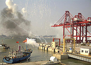 7月24日下午3時左右,隨著三發(fā)紅色信號彈升空,眾多艘民船商船在福建省廈門灣南岸的漳州港海面上集結(jié),船上裝載著武器裝備和人員,這些船迅速與海面部隊對接。