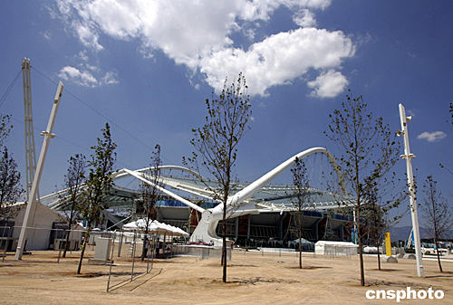 當(dāng)?shù)貢r(shí)間8月2日中午,驕陽(yáng)曝曬幾乎無(wú)遮無(wú)掩、基本完工的希臘雅典奧運(yùn)會(huì)主會(huì)場(chǎng)。由于時(shí)間緊迫和經(jīng)費(fèi)緊張,這所頗為新穎的建筑周邊基本沒(méi)有綠化。中新社記者:任晨鳴