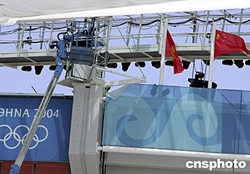 當(dāng)?shù)貢r(shí)間8月2日中午,驕陽映照正在緊張排練奧運(yùn)會(huì)開幕式的希臘雅典奧運(yùn)會(huì)主會(huì)場(chǎng)。國(guó)際奧委會(huì)所有會(huì)員的旗幟在體育場(chǎng)四周依次排列,鮮艷的中國(guó)國(guó)旗在體育場(chǎng)西南方向迎風(fēng)飄揚(yáng)。中新社記者:任晨鳴