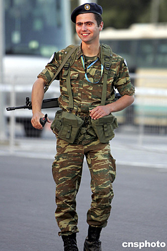 當(dāng)?shù)貢r(shí)間8月2日傍晚,一名肩挎微型沖鋒槍的希臘軍警執(zhí)勤后輕松地下崗返回軍營(yíng)。奧運(yùn)會(huì)期間,雅典奧運(yùn)會(huì)所有場(chǎng)地除了警方嚴(yán)加守衛(wèi)外,都有配備沖鋒槍的軍警執(zhí)勤,防范恐怖襲擊。中新社記者:任晨鳴