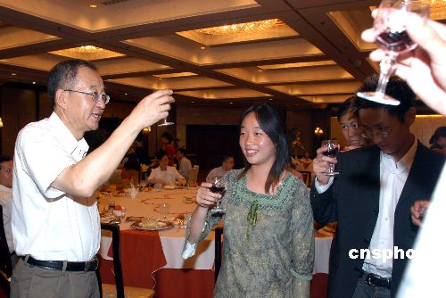 國務(wù)院僑辦和上海市僑辦今天聯(lián)合舉行宴會歡迎參加夏令營的海外優(yōu)秀華裔青年。劉澤彭向身邊的帶隊(duì)人員詢問了夏令營日間活動的有關(guān)情況,席間大家談笑風(fēng)生。