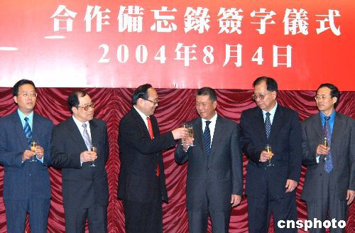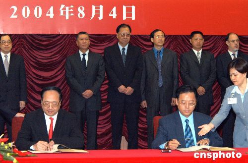 八月四日,中國人民銀行副行長李若谷與澳門金融管理局主席丁連星在澳門特區(qū)政府總部多功能廳分別代表雙方簽署澳門銀行辦理個人人民幣業(yè)務合作備忘錄,澳門特別行政區(qū)行政長官何厚鏵等出席簽字儀式。作者:梁永強