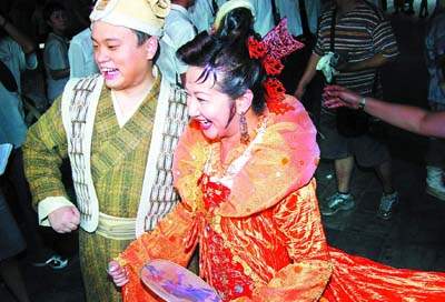 昨日的開機(jī)儀式吸引了粵港兩地近百名記者到場采訪,而整個開機(jī)儀式就正如前天楊盼盼所說的要辦成一個“節(jié)目”,劇組方面在影視城偌大的廣場上搭建了一個舞臺,開機(jī)儀式先由有主持經(jīng)驗的韓君婷和利嘉兒擔(dān)任司儀,而這兩個司儀特意穿上戲服以戲中的造型出現(xiàn)。在這兩位司儀的介紹下,身穿一件麻布長褂一副店小二造型的孔慶翔與身穿大紅長褂,手執(zhí)香扇一副老板娘打扮的薛家燕率先登上舞臺,一直保密的兩位主角的造型終于在開機(jī)儀式上曝光。一時間閃光燈此起彼落,而首次穿上戲服面對傳媒的孔慶翔似乎還不習(xí)慣這種場面,不敢望著記者的鏡頭,一直與身旁的薛家燕和恬妞兩位前輩竊竊私語。隨后,該片其他演員在司儀的介紹下陸續(xù)登上舞臺與記者見面,最后二十多位演員與導(dǎo)演、監(jiān)制以及投資方的代表來一個大合照,此時主辦者突然燃放煙花和發(fā)射彩帶,同時舞臺上升起一條橫幅寓意這部片子能取得好的票房,簡單的開機(jī)儀式就此結(jié)束。