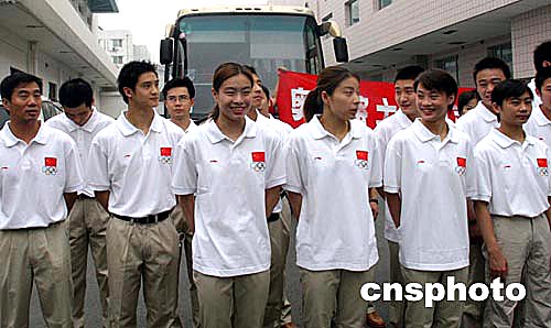 8月8日,中國(guó)奧運(yùn)軍團(tuán)從北京出征2004雅典奧運(yùn)會(huì),中國(guó)跳水隊(duì)在北京集合準(zhǔn)備出發(fā)奔赴雅典奧運(yùn)會(huì)賽場(chǎng)。中新社記者:盛佳鵬