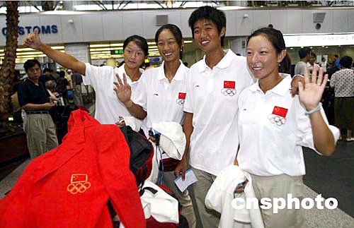 8月8日,中國奧運(yùn)軍團(tuán)從北京出征2004雅典奧運(yùn)會(huì),中國網(wǎng)球隊(duì)晏紫、孫甜甜、李婷、鄭潔、四名女隊(duì)員在北京首都國際機(jī)場(chǎng)合影,信心十足的奔赴雅典奧運(yùn)會(huì)賽場(chǎng)。中新社記者:盛佳鵬